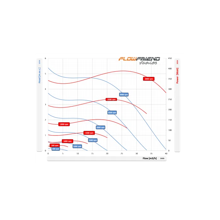 Ebenso wie die anderen Air-Aqua FlowFriend-Pumpen ist das Modell Junior mit einer Hydraulik vom Mixed-Flow-Typ aus Edelstahl RVS316 ausgestattet. Damit bietet sie eine Förderhöhe bis zu 5.5 m und einen regelbaren Durchsatz bis zu 40 m³/h, wodurch die Pumpe auf effiziente Weise in einem großen Anwendungsspektrum eingesetzt werden kann. Die Pumpe ist über eine externe Steuerung vollständig regelbar (500–3000 U/min).