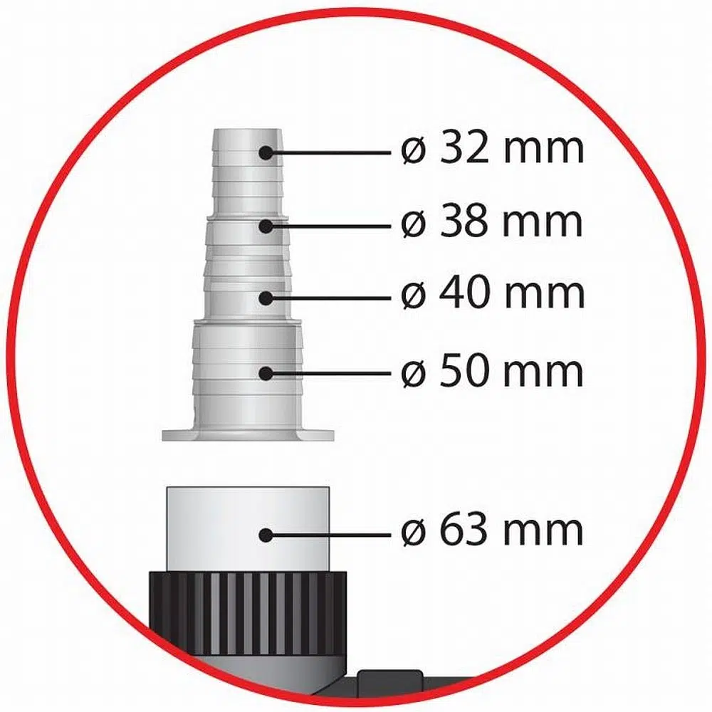 Mit drei verschiedenen Anschlussmöglichkeiten (2 x 63 mm und 1 Blindstopfen) sowie speziellen Schlauchtüllen (32/38/40/50 mm) bietet das Gerät vielfältige Möglichkeiten für eine maßgeschneiderte Installation in Ihrem Teich.