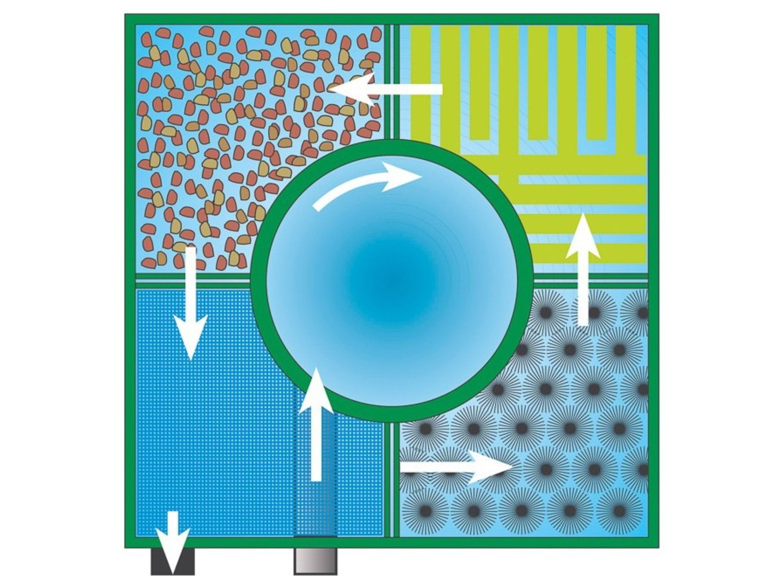 In den letzten 3 Kammern wird das Teichwasser biologisch aufbereitet und von giftigen Stickstoffbindungen, wie Nitrit und Ammonium befreit. Zudem ermöglichen die Filtermedien die Ansiedlung von verschiedenen Bakterienstämmen. Nach der letzten Kammer wird das Wasser über ein 110mm Rohr wieder zurück in den Teich befördert.