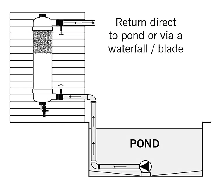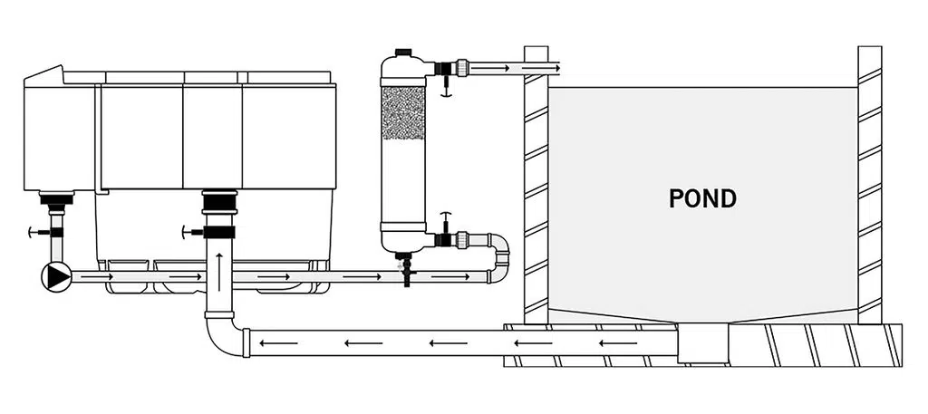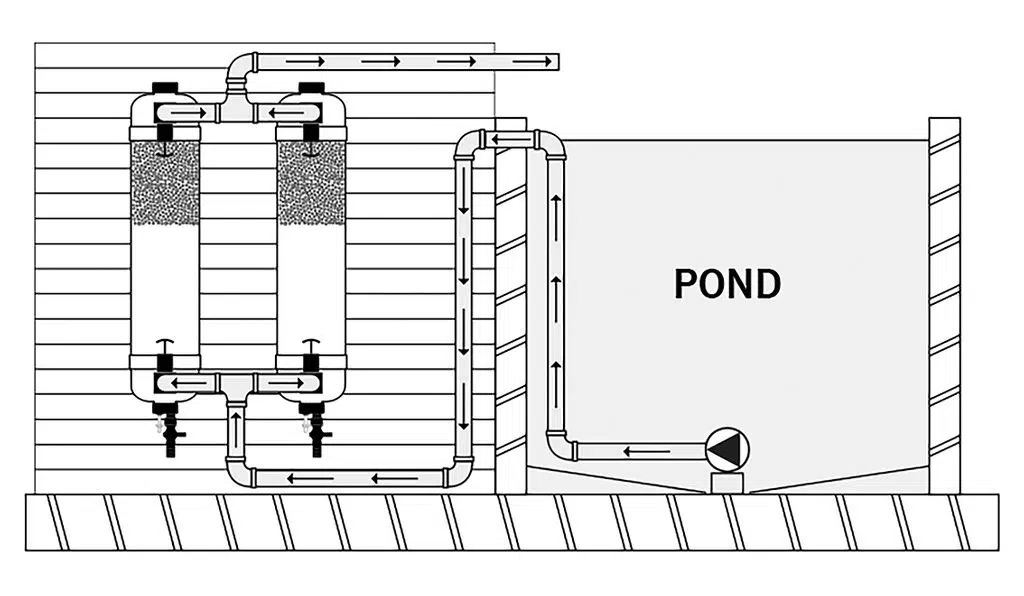 Das Wasser wird von unten nach oben durch den Tempest-Filter gepumpt. Hierbei sammelt sich das Filtermaterial K+ Media im oberen Teil des Behälters und bildet eine mechanische Barriere, in welcher in dem K+ Media die Schmutzpartikel aufgefangen werden. Während des Reinigungsvorgangs wird beim Entleeren des Filters mit Hilfe einer Venturidüse Luft angesaugt, so dass das Wasser mit dem K+ Media verwirbelt und so die aufgefangenen Schmutzpartikel effektiv mit ausgespült werden.