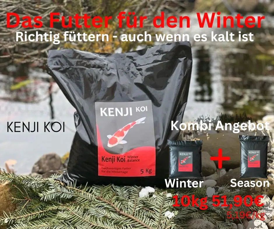 Sie erhalten jeweils 5 Kilo unserer zwei Futtersorten für die kalten Tage zum heißen Preis. Unser hochwertiges leichtverdauliches KENJI KOI Season mit einem hohen Fischmehlanteil und leichtverdaulichen Weizenkeimen sowie mit speziellen Prebiotischen Ballaststoffen sowie Omega3.