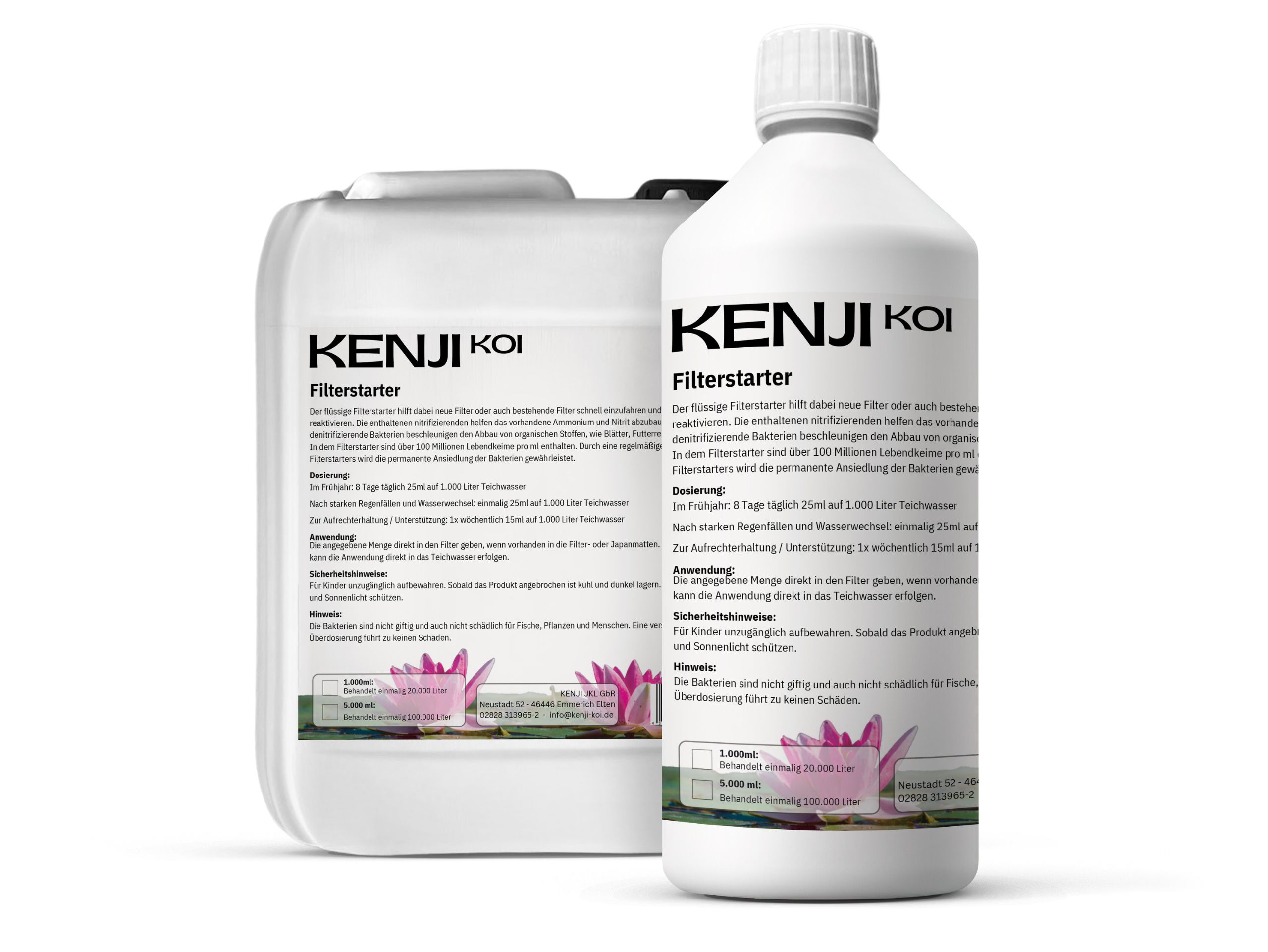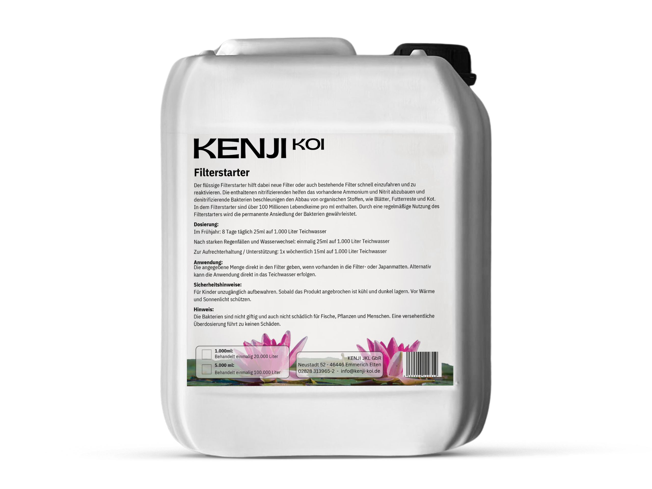 Der KENJI KOI Filterstarter hilft dabei neue Filter oder auch bestehende Filter schnell einzufahren und zu reaktivieren. Die enthaltenen nitrifizierenden Bakterien helfen das vorhandene Ammonium und Nitrit abzubauen und denitrifizierende Bakterien beschleunigen den Abbau von organischen Stoffen, wie Blätter, Futterreste und Kot. In dem Filterstarter sind über 100 Millionen Lebendkeime pro ml enthalten, welche für eine schnelle Abhilfe bei schlechten Wasserwerten sorgt.