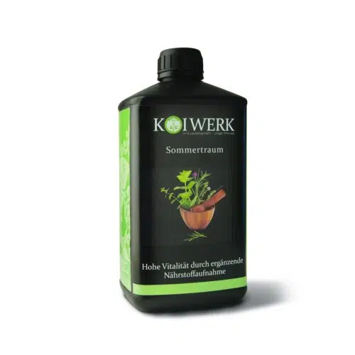 Die Nahrungsaufnahme ist bei Koi nicht auf das Fressen begrenzt. Durch den Einsatz von flüssigem Zusatzfutter nehmen Ihre Koi zusätzlich lebensnotwendige hochwertige Nährstoffe aus dem Wasser auf. Sommertraum von KOIWERK ist die hochwertige Wassernahrung für Ihre Koi. Durch den Einsatz von Sommertraum nehmen Ihre Koi neben dem Futter zusätzlich lebensnotwendige hochwertige Nährstoffe aus dem Wasser auf. Das optimierte Nahrungsverhalten sorgt nachhaltig für eine ausgewogene Ernährung sowie die Verbesserung des Eiweißstoffwechsels. Zusätzlich wird die Enzymbildung angeregt und die Bildung der weißen und roten Blutkörperchen unterstützt. Ergebnis ist die Stärkung des Immunsystems und eine bessere Schleimhaut.