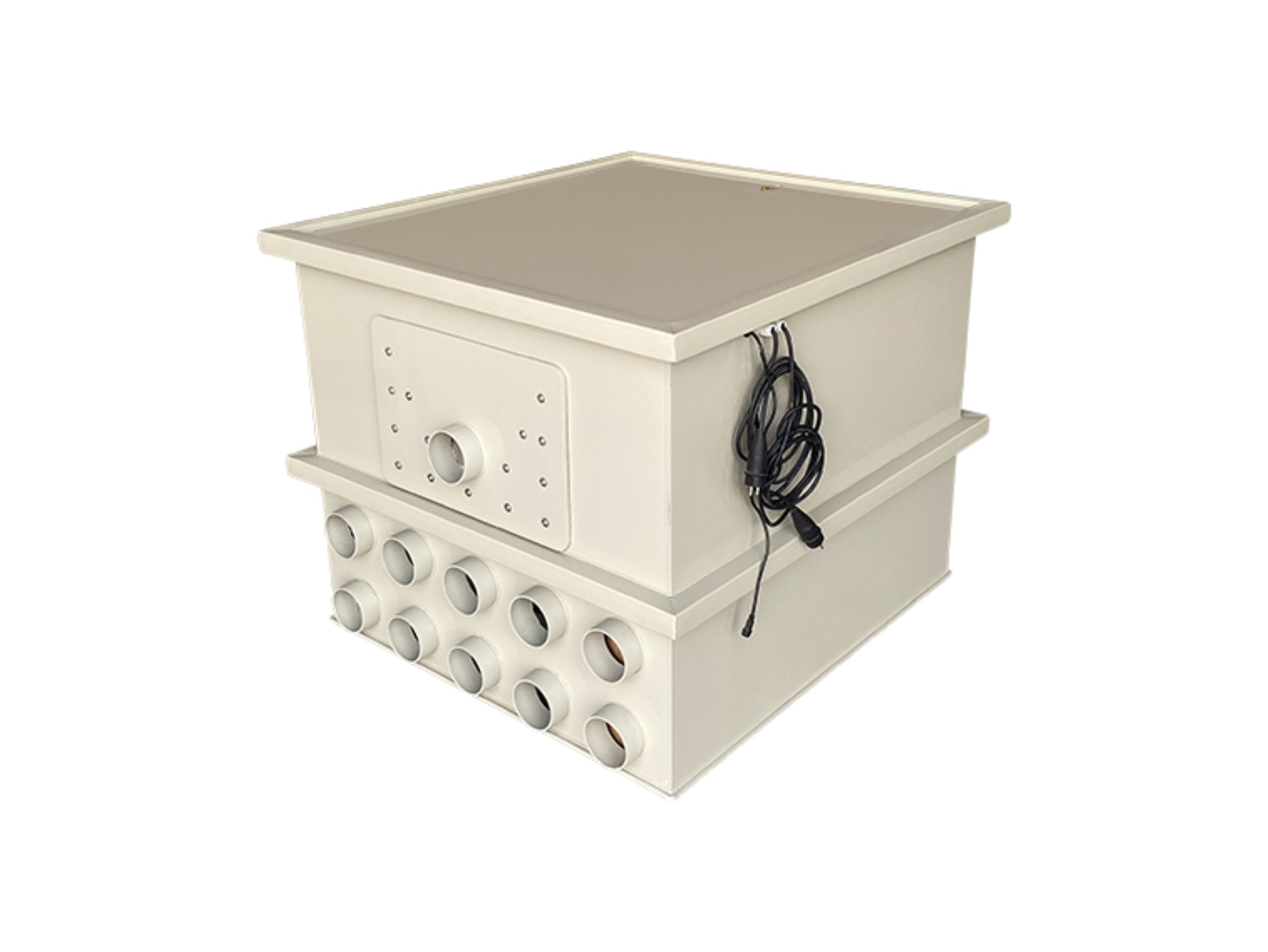 Der Filter verfügt über 10 Einläufe, 5 Abläufe und einem Schmutzablauf. Die Anschlüsse haben einen Durchmesser von 110mm, wodurch ein ausreichender Durchfluss gewährleistet wird.