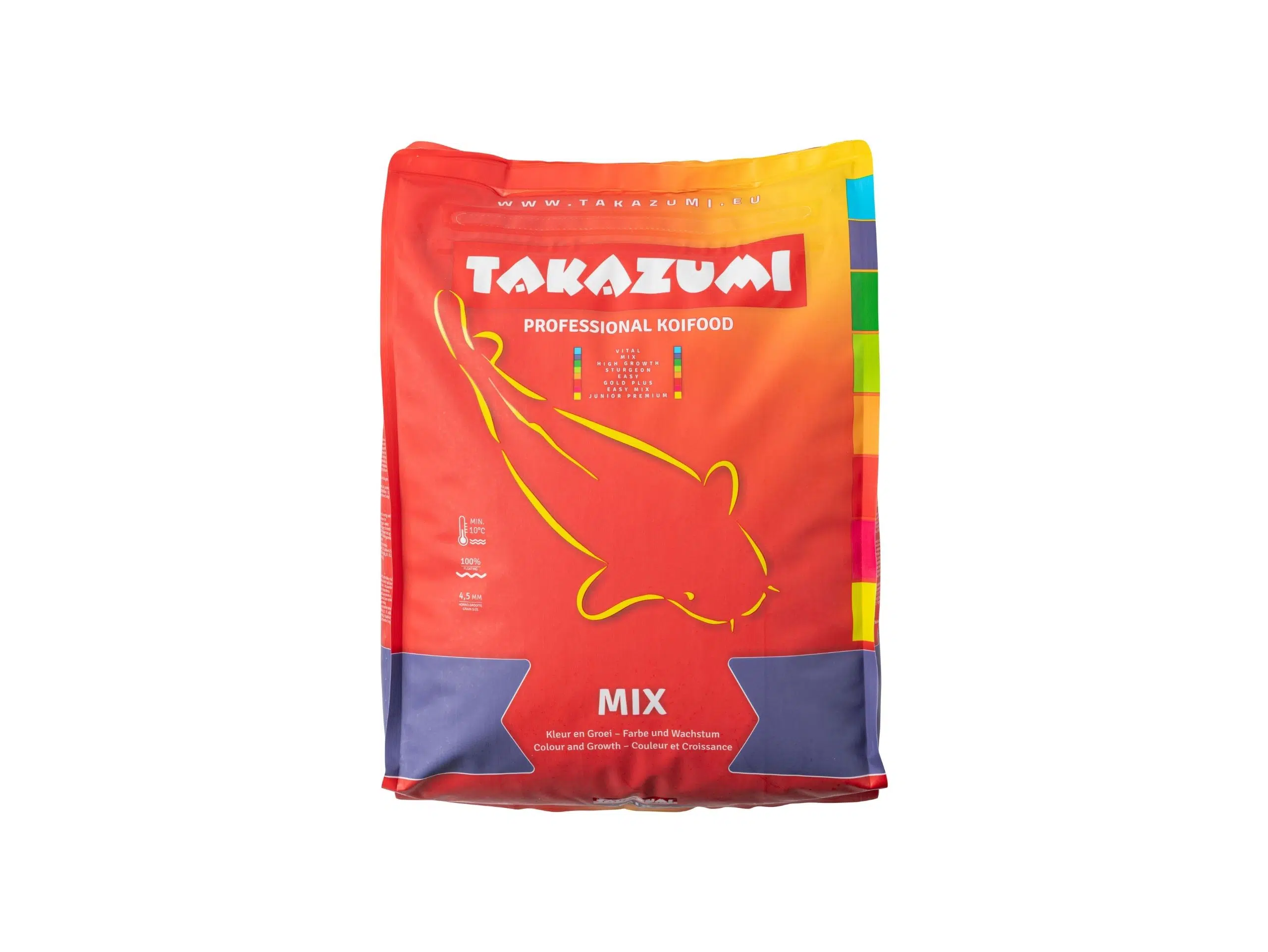 Takazumi garantiert die hohe Produktqualität, bei ungeöffneter Verpackung und sachgemäßer Lagerung, bis an das Mindesthaltbarkeitsdatum. Nur bis zu einer Wassertemperatur von 10°C füttern. Dosiertes füttern verhindert eine Wassertrübung.